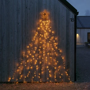 Im Garten lassen sich mit großzügigen Lichtinstallationen eindrucksvolle Szenen gestalten. Höhenunterschiede durch leuchtende Figuren am Boden, Lichterketten in Bäumen oder aufgestellte Sterne erzeugen Tiefe und Atmosphäre. Einzelne Lichtquellen können als Inseln wirken, die über Wege, Sträucher oder Beete verteilt sind. Farblich abgestimmte Leuchtelemente in Braun, Grün oder Silber fügen sich dabei harmonisch in die natürliche Umgebung ein.