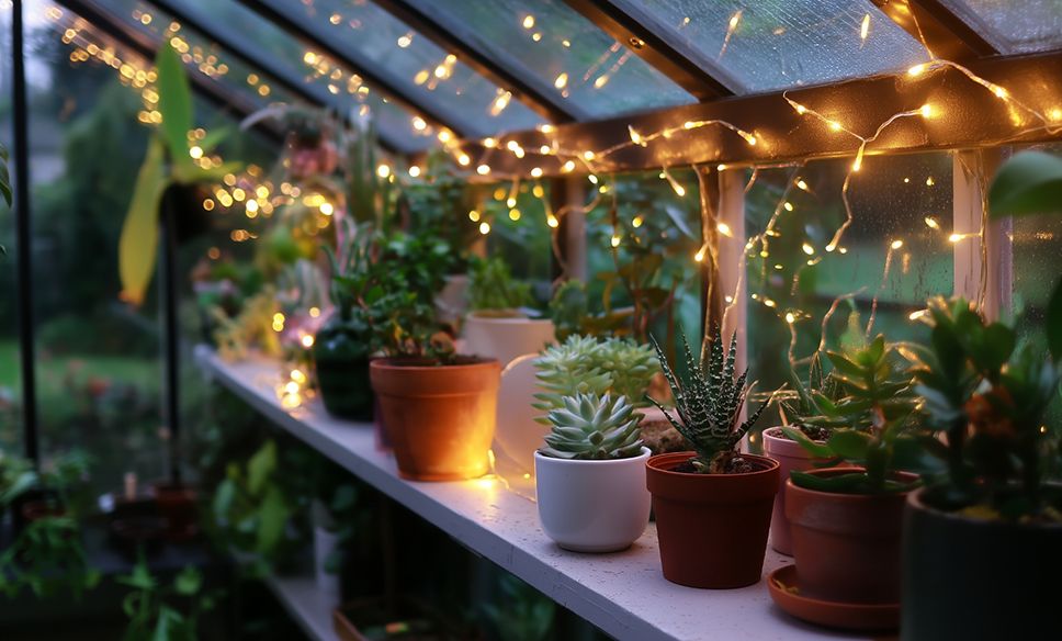 Mit der richtigen Beleuchtung wird das Gewächshaus auch im Winter zu einem nutzbaren Rückzugsort, an dem gewerkelt und geplant werden kann. Besonders gemütlich und ansprechend wird es, wenn Sie saisonale Dekoration mit Licht einplanen – von der Weihnachtslichterkette bis zum leuchtenden Stern.