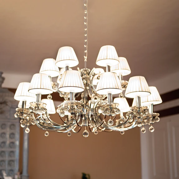 Welches der schmückenden Details des 18-flammigen Kronleuchters Kristalldesign sollte man zuerst nennen? Keines oder alle, denn sie ergeben in ihrer Komposition einen Lichtspender, der unbeleuchtet bereits ein Highlight darstellt, mit Beleuchtung jedoch einen faszinierenden Glanz verbreitet, der seinesgleichen sucht. Die Stoffschirme scheinen aus einzelnen Silberfäden zu bestehen, was dem abstrahlenden Licht besonderen Charme verleiht. Das Licht lässt auch die wundervollen Swarovski-Kristalle eindrucksvoll funkeln. Die glänzende Verchromung der im Querprofil quadratisch gearbeiteten Lüsterarme ergänzt das fantastische Ensemble, das jedes große Wohnzimmer schmückt. Auch für die festliche Illumination von Sälen in Hotels geeignet. Leuchtmittel nicht inklusive. Die 40-Watt-Kerzenlampen können über Zubehör bestellt werden.