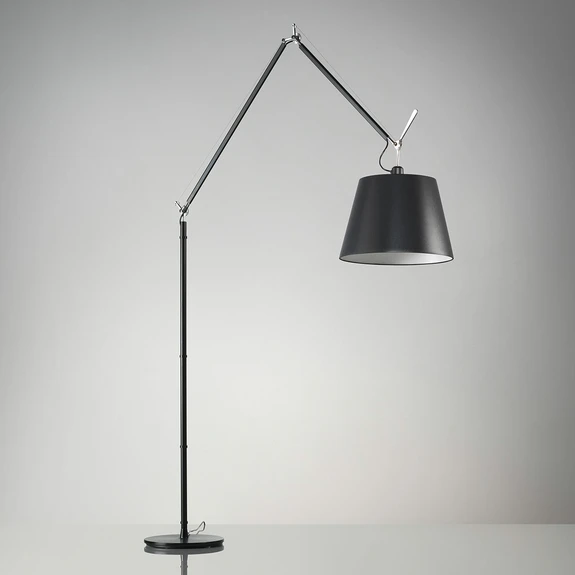Modern und doch von zeitloser Eleganz geprägt, zeigt sich die LED-Stehleuchte Tolomeo Mega optisch. Von ihrem schlanken Aluminiumgestell, das sich mehrfach verstellen lässt, hängt am Kopfende ein Schirm aus schwarzem Satin. Die Weite des Schirms bewirkt eine großflächige Verbreitung des abstrahlenden Lichts, das nicht nur nach unten abgegeben wird, sondern auch rundherum zart durch den schwarzen Stoff scheint. Am Kopfende befindet sich ein Dimmer, mit dem sich die Lichtstärke bedarfsgerecht einstellen lässt.