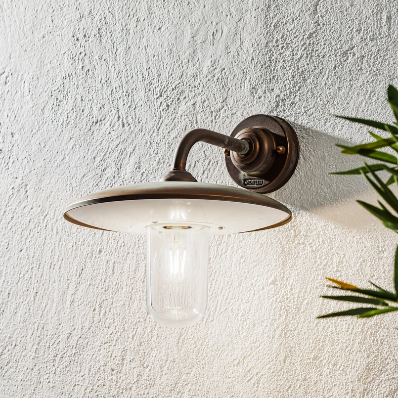 Die Außenwandleuchte CASALE besticht mit schlichter Eleganz. Der weite Schirm schützt das klare Glas und reflektiert das Licht so, dass es nach unten strahlt und den Außenbereich weiträumig ausleuchtet. Als Hauptmaterial wurde Altmessing gewählt, welches in Kupferoptik lackiert wurde. Durch die Schutzart IP44 ist diese Wandleuchte bestens für den Außenbereich geeignet. Als Wegebeleuchtung oder im Eingangsbereich kann sie daher sehr gut eingesetzt werden.