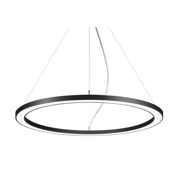 Die als flacher Ring gearbeitete LED-Hängeleuchte Biro Circle Ring aus Aluminium und einer opalweißen Abdeckung aus Kunststoff ist mit einem elektronischen, per DALI dimmbaren Betriebsgerät ausgestattet. Der Leuchtenschirm hängt an feinen Stahlseilen vom runden Baldachin ab. Durch die rotationssymmetrisch tief-breit-strahlende Lichtstärkeverteilung und die weiße Abdeckung aus Kunststoff strahlen die ringsum im Ring verbauten LEDs eine gleichmäßige Beleuchtung nach unten ab. Die Leuchte mit sehr langer Lebensdauer und hoher Systemeffizienz ist perfekt für Büro- oder Konferenzräume.