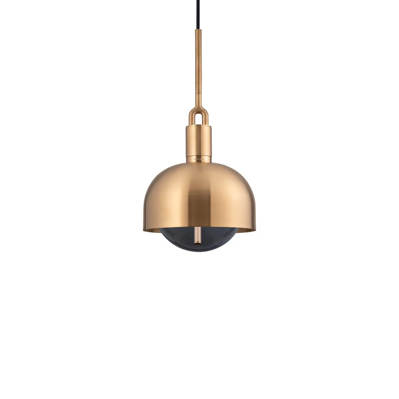 Der Schirm der Hängeleuchte Forked besteht innen aus einer mundgeblasenen Kugel aus rauchfarben getöntem Glas und einem darüber liegenden Schirm aus massivem Messing. Das Metall wurde zum Teil von Hand bearbeitet. Auch die Hängeleuchte Forked trägt das Markenzeichen von Buster + Punch: das Rändelmuster an der Leuchtenfassung mit dem Schriftzug des Labels. Ebenso spiegelt sich in dieser Hängeleuchte die Liebe des Herstellers zu massiven Metallen wider. Neben Leuchten stellt Buster + Punch aus diesen Materialien auch Beschläge und Einrichtungsgegenstände her. Eine LED-Lampe mit E27-Sockel und warmweißer Lichtfarbe wird mitgeliefert. Sie strahlt ihr Licht durch das rauchfarbene Glas sehr behaglich ab und kann mit einem für LED-Lampen geeigneten Dimmer zusätzlich in ihrer Helligkeit reguliert werden. Forked ist eine Pendelleuchte, die nicht nur in privaten Räumen eine schöne Atmosphäre schafft, sondern auch in Hotels oder gastronomischen Bereichen ihre Wirkung entfaltet.