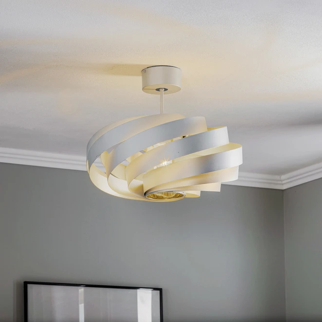 Die elegante Optik der Deckenleuchte Vento entsteht durch das überzeugende Design des Lampenschirms. Dieser besteht aus breiten Metallstreifen, die geschickt zu einer ovalen Form gedreht wurden. Das Licht strahlt hierbei nicht nur nach unten, sondern auch seitlich durch die kleinen Öffnungen des Schirms hindurch, so dass eine angenehme Raumbeleuchtung entsteht. Die Hängeleuchte Vento eignet sich hervorragend für die Beleuchtung des Wohn- oder Schlafzimmers. Aber auch im Flur oder der Küche kann die moderne und elegante Optik auf ganzer Linie punkten.