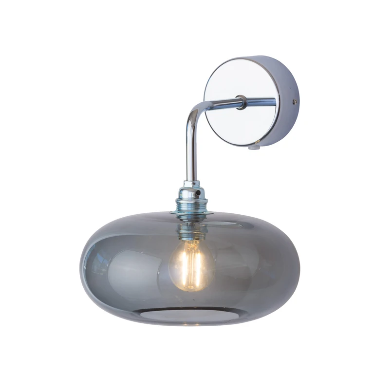 Die Wandleuchte Horizon vereint zeitlose skandinavische Ästhetik mit hochwertigen Materialien. Das Zusammenspiel von rauchgrauem mundgeblasenem Glas und silberfarbenen Elementen schafft eine harmonische Balance zwischen natürlicher Wärme und moderner Eleganz.