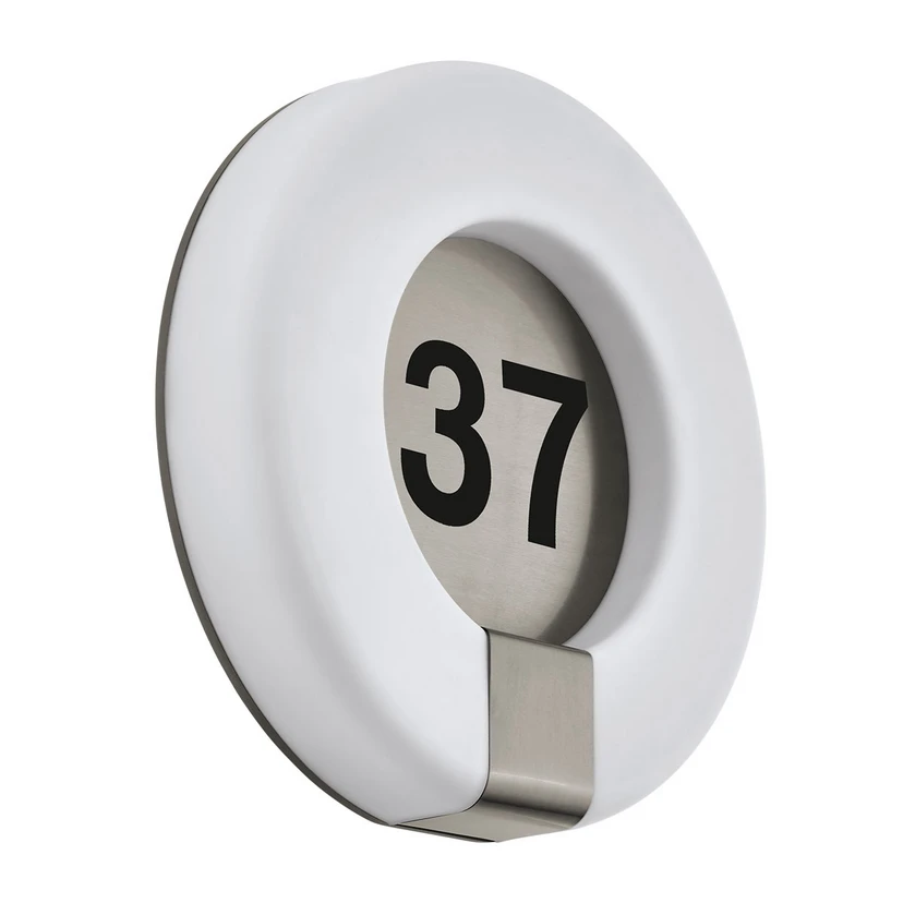 Helle, energiesparende Beleuchtung des Außenbereiches und eine deutlich erkennbare Hausnummer - beides bietet die LED-Außenwandleuchte Marchesa-C, die in runder Form mit einem von LEDs erhellten Kunststoffring gearbeitet wurde. Sie wird mit einem Satz (Ziffern 0 - 9, Buchstaben a - f) zum Aufkleben der Hausnummer in der Mitte des leuchtenden Ringes geliefert.