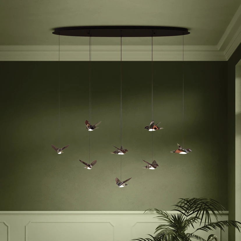 Die LED-Hängelampe Paratebueno wird durch ihr besonderes Design zum Blickfang in jedem Raum. Von einem oval geformten Baldachin hängen 8 Vögel aus Metall herab, die umherzuflattern scheinen. Durch dieses Design erinnert die Leuchte an ein Mobilé. In Bauch eines jeden Vogels sitzt ein warmweißes LED-Lichtelement, so dass das Licht effektvoll und gleichmäßig nach unten abgestrahlt wird.
