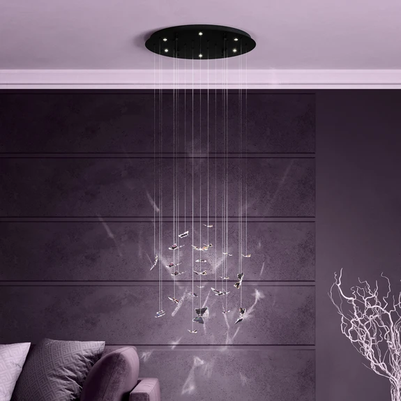 Die LED-Hängeleuchte Adrados vereint ein außergewöhnliches Design mit effektvoller Lichtwirkung. Gefertigt aus hochwertigem Stahl und transparentem Glas, präsentiert sich die Leuchte mit einem runden Baldachin, von dem zahllose Schmetterlinge unterschiedlicher Größen aus transparentem Glas abhängen. Das warmweiße Licht der sechs LED-Lichtquellen im Baldachin setzt die Schmetterlinge effektvoll in Szene. Die LED-Hängeleuchte Adrados setzt im Esszimmer oder Wohnzimmer eindrucksvolle Akzente und wird zum einzigartigen Blickfang.