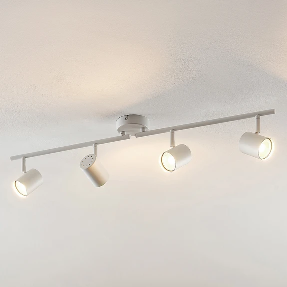 Diese Deckenleuchte der Strahlerserie Tomoki ist vierflammig und damit sehr gut geeignet, um in einem Raum wie der Küche, dem Wohnzimmer oder einem Flur als Grundbeleuchtung eingesetzt zu werden. Jeder runde, zylinderförmige Strahler kann beliebig ausgerichtet werden, wodurch sich der Lichtschein gut an die Situation anpassen lässt. Die Leuchte kann mit GU10-Leuchtmitteln bestückt werden (siehe Zubehör). Ein schöner Allrounder für die meisten modernen Stile!