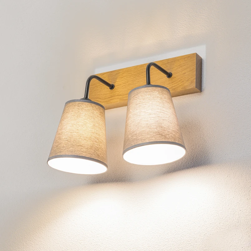 Die Formgebung der zweiflammigen Wandlampe Risco mit rechteckiger Wandbefestigung und Kegelstumpf-Schirmen ist absolut zeitlos. Der graue Stoff der Schirme und das Eichenholz der Wandplatte, die über zwei kurze Ausleger aus schwarz lackiertem Stahl verbunden sind, ergeben einen vielseitig kombinierbaren Lichtspender von wohnlichem und natürlichem Charakter.