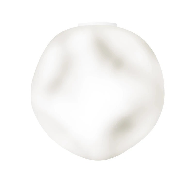 Die Deckenleuchten Hoba, die aus mattem, geblasenem Glas hergestellt werden, weisen eine asymmetrische und unregelmäßige Form auf, die an einen beim Herabfallen kristallisierten Meteorit erinnert. Das Glas wird mundgeblasen und weist bestimmte Unregelmäßigkeiten auf, die Zeugnis der wertvollen Handarbeit sind. Jede Leuchte wird dadurch zum Unikat.