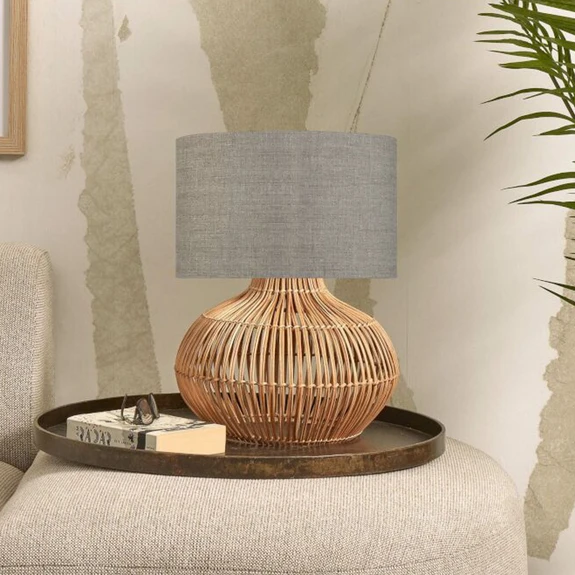 Dekorative Tischleuchte Kalahari mit Rattanfuß und Leinenschirm