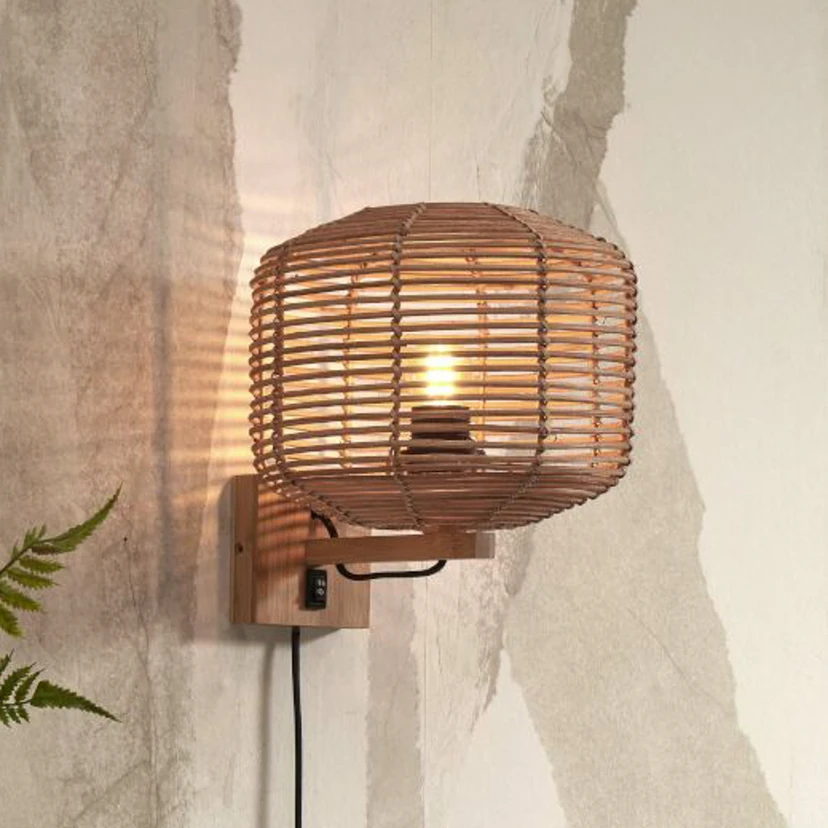Wandleuchte Tanami mit Stecker und rundem Schirm aus Rattan