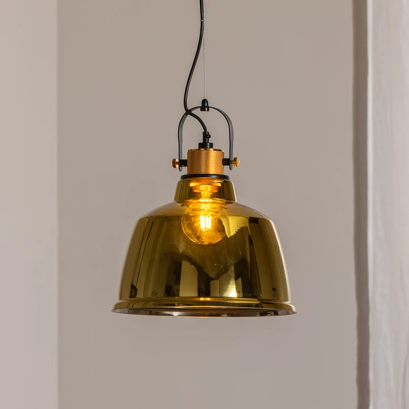 Die Hängeleuchte Amalfi vereint industrielles Design mit einem Hauch von Eleganz. Gefertigt aus metallisiertem Glas und robustem Stahl, bietet sie eine beeindruckende Kombination aus Stil und Funktionalität. Die goldene und schwarze Farbgebung verleiht der Leuchte eine zeitlose Ästhetik, die sich nahtlos in verschiedene Raumkonzepte wie Wohnzimmer, Küche oder Esszimmer einfügt. Ein besonderes Merkmal ist der schwenkbare Schirm, der eine flexible Lichtausrichtung ermöglicht und so für eine individuelle Beleuchtung sorgt.