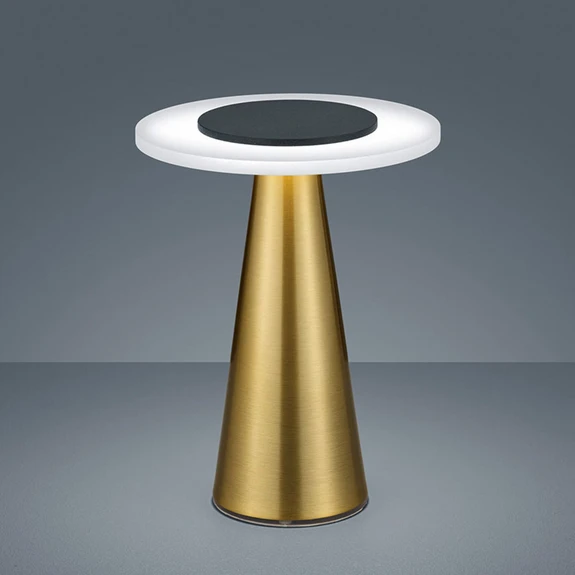 Zum einen ist es die Farbkombination, die der Tischleuchte Bax ihre besondere Wirkung verleiht, zum anderen ist es die futuristische Gestaltung. Letztere erwächst aus einem konisch nach oben zulaufenden Fuß aus Metall in mattem Messingfinish und integriertem Touchfunktion sowie dem flachen Diffusor in Form eines satinierten Acrylrings, der von einer etwas kleineren, schwarzen Metallplatte oben abgedeckt wird. Letzterer sorgt für eine homogene Abgabe des warmweißen Lichts.