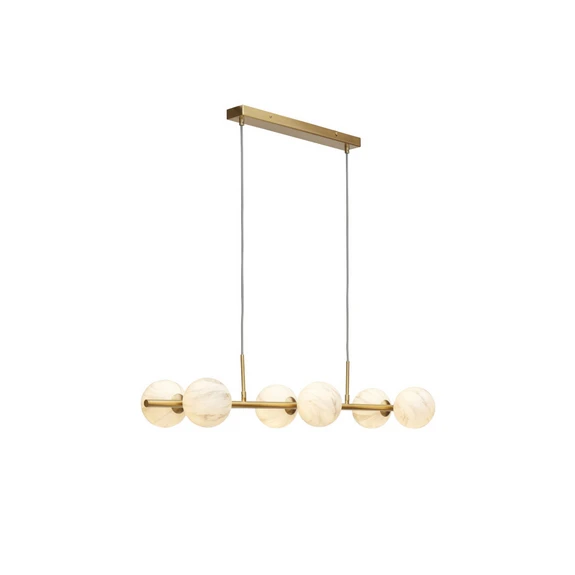 Die sechsflammige Pendelleuchte Carrara besteht aus einer waagerecht angeordneten Stange, an der jeweils links und rechts die insgesamt sechs kugelförmigen Schirme montiert sind und der hellgrauen Abhängung, die in den goldenen Baldachin mündet. Die weiß-grau marmorierten Kugeln sind aus Glas gefertigt und geben ein blendfreies Licht ab. Durch Form und Lichtwirkung der Hängelampe eignet sie sich ideal zur Beleuchtung eines länglichen Esszimmertisches.
