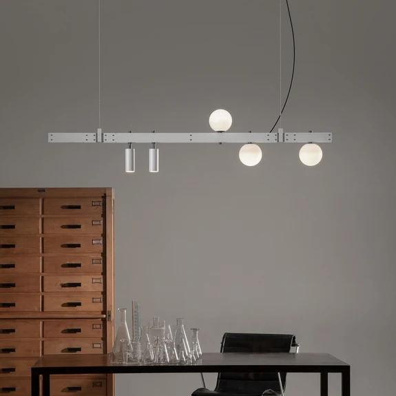 Auf den ersten Blick könnte man vielleicht meinen, Stant wäre eine gewöhnliche Pendelleuchte. Das Besondere an ihr ist jedoch, dass der Aluminiumrahmen so gefertigt ist, dass die Lichtmodule - drei mundgeblasene, opale Glaskugeln und zwei zylindrische Spots - individuell fixiert werden können und zwar wahlweise an der Ober- oder Unterseite des Balkens. Die integrierten Leuchtmittel sind dimmbar, es wird jedoch ein externer 0-10 V Dimmer benötigt.