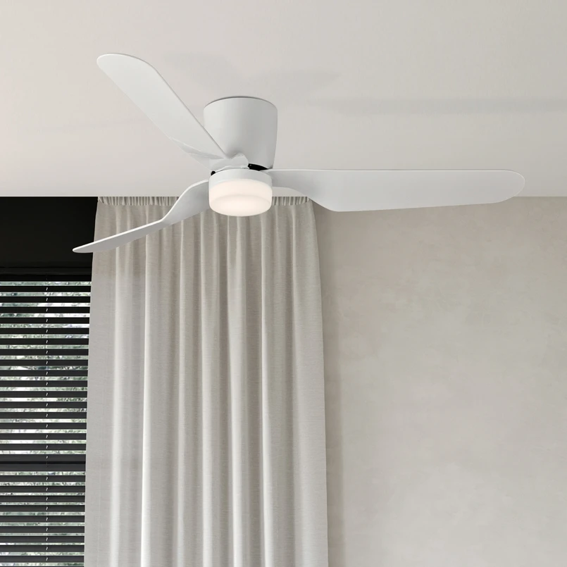 Mit drei weißen Flügeln aus Kunststoff und einem leisen DC-Motor ist der LED-Deckenventilator Brisa ausgestattet. Das integrierte LED-Modul erzeugt warmweißes Licht, das sich dank eines niedrigen Blendungswertes (UGR<19) auch für Bildschirmarbeitsplätze eignet. Eine Fernbedienung (inkl. Batterie) mit Wandhalterung zur Steuerung aller Funktionen liegt bei.