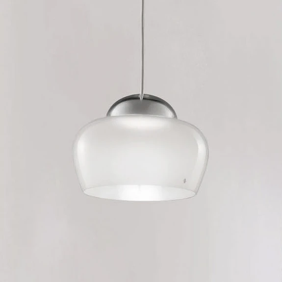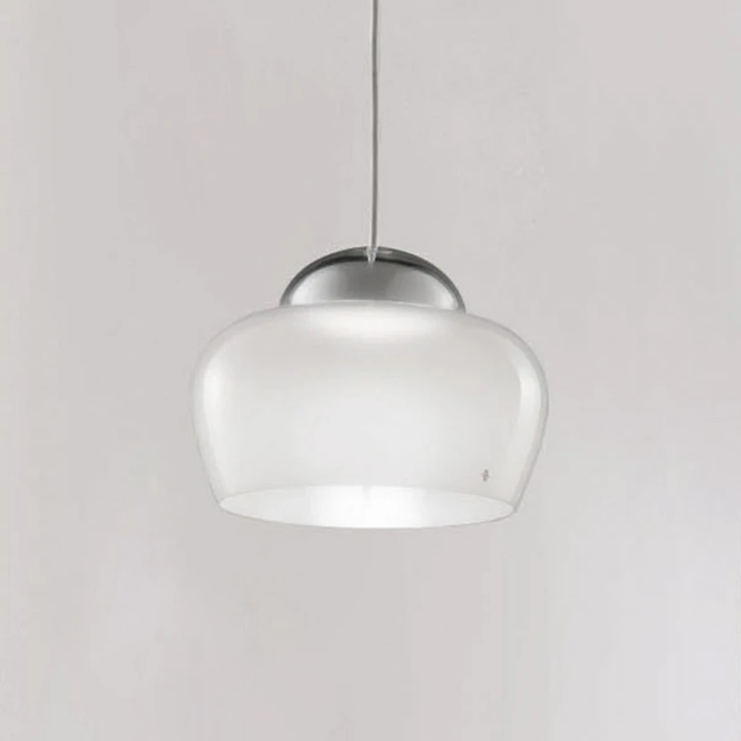 Die bauchige Schirmform der LED-Pendelleuchte Cristallina wird durch die LED-Lichtquelle, die in der oberen Mitte unter der halbkugelförmigen Fassung verbaut ist, perfekt in Szene gesetzt. Das Licht wird nach unten abgestrahlt und spiegelt sich auch in dem Glas, sodass ein wunderschöner Effekt entsteht.