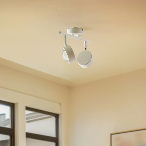 Der zweiflammige Deckenstrahler Jyla besteht aus Eisen und verleiht der Umgebung durch sein weißes Äußeres eine edle Note. Zugleich fügt er sich durch sein dezentes Design mühelos in unterschiedliche Wohnbereiche ein. Er lässt sich beispielsweise ideal als Lichtspender für den Flurbereich, die Küche sowie das Wohn- oder Esszimmer nutzen. Die runden Schirme sind verstellbar und sorgen damit für eine individuelle Ausrichtung des Lichts und eine optimale Ausleuchtung des Raums. Die mitgelieferten GX53-Leuchtmittel haben eine gewölbte Linse und sehen daher aus wie gläserne Halbkugeln.