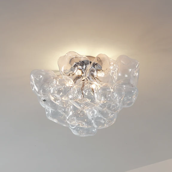 Bestehend aus 16 unregelmäßig geformten Glaskugeln, die transparent gestaltet sind, erzeugt die Deckenlampe ein faszinierendes Lichtbild. Die vier G9-Leuchtmittel, die eingesetzt werden müssen, strahlen die Kugeln an und lenken das Licht in alle Richtungen.
