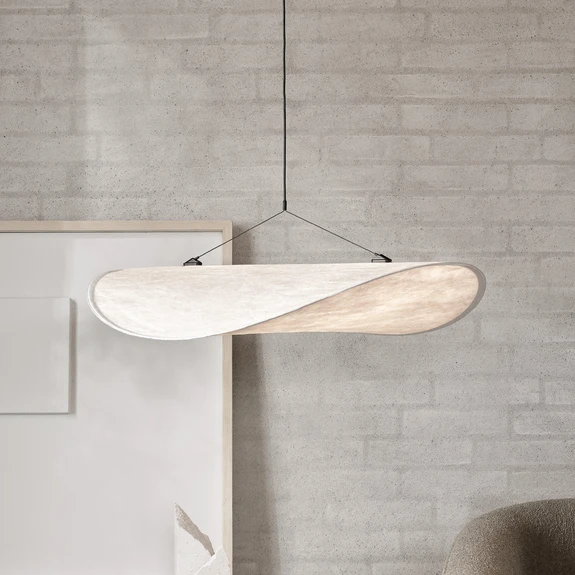 Die Hängeleuchte Tense stammt aus dem Hause New Works, einem dänischen Leuchtenhersteller, dessen Leuchtendesigns an die skandinavische Geschichte der Handwerkskunst und Materialität angelehnt sind. Entworfen von den Designern Panter & Tourron haben sie damit eine Leuchte geschaffen, die mit ihrem Design die Grenzen zeitgenössischen Designs verschiebt.