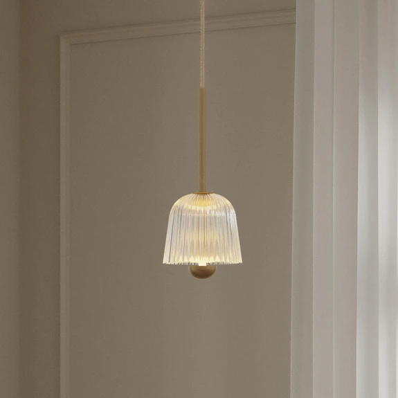 Messingfarbene LED-Hängelampe Asteea 1 mit klarem, geriffeltem Schirm