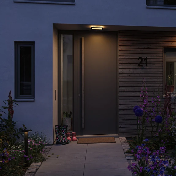 Eine schöne Atmosphäre entsteht durch die LED-Außenwandleuchte Lamina an jeder Fassade. Die Leuchte ist mit einem Backlight sowie einem Bewegungssensor und einem Dämmerungssensor ausgestattet. Mit Einbruch der Dunkelheit schaltet sich das Licht mit einer Lichtstärke von 20 % und einem sehr warmen, insektenfreundlichen Goldlicht (2.200 K) dauerhaft ein. Erkennt der Bewegungsmelde mit einer Reichweite von 5 Metern und einem Erfassungsbereich von 90° eine Bewegung, schaltet sich warmweißes Licht (3.000 K) mit 100 % Helligkeit ein. Nach einer Leuchtdauer von 30 Sekunden schaltet die Leuchte automatisch wieder auf 20 % Goldlicht. Die Leuchte eignet sich auch zur Deckenmontage, wobei der Sensor bei einer Deckenhöhe von 2,5 Metern ausreichend ist.