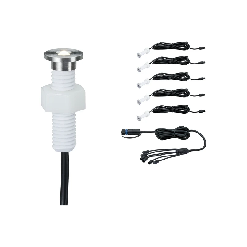 Auf Wegen, Palisaden und Grünflächen lassen sich mit der LED-Einbauleuchte 93694 aus silbernem Edelstahl effektvolle Lichtakzente schaffen. Angesichts des geringen Lichtstroms ist 93694 insbesondere für dekorative Zwecke geeignet. Rückseitig hinter der Montageöffnung kann als Gegenhalterung eine Mutter aufgeschraubt werden. Das Set beinhaltet fünf Leuchten mit je 2 m Zuleitung und eine 2 m lange Verlängerungsleitung mit sechs Ausgängen; letztere sind bei Nichtnutzung mit den beiliegenden Kappen zu verschließen. Der benötigte 230 V-Netzanschluss mit Trafo kann einzeln erworben oder als Bestandteil des Basis-Sets bezogen werden (siehe Zubehör).