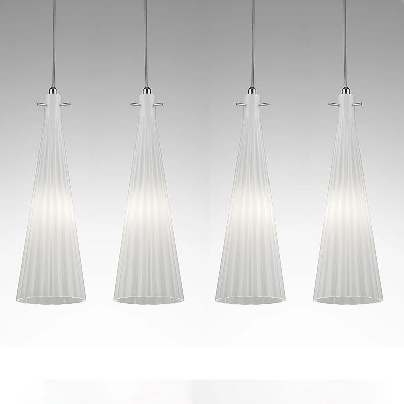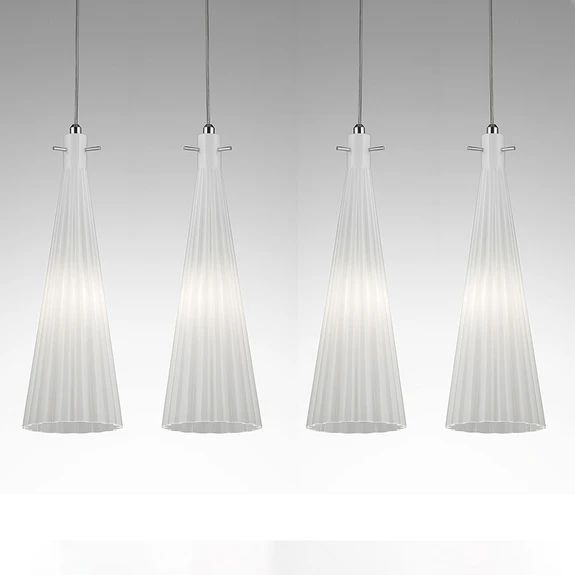 Die in Italien gefertigte Pendelleuchte Costa Rica ist mit vier Glasschirmen ausgestattet, die wie Trichter geformt sind und eine geriffelte Beschaffenheit haben. Das Glas der Schirme ist mundgeblasen und weist aus diesem Grund kaum wahrnehmbare Variationen aus, weshalb jeder Schirm sozusagen ein Einzelstück ist.