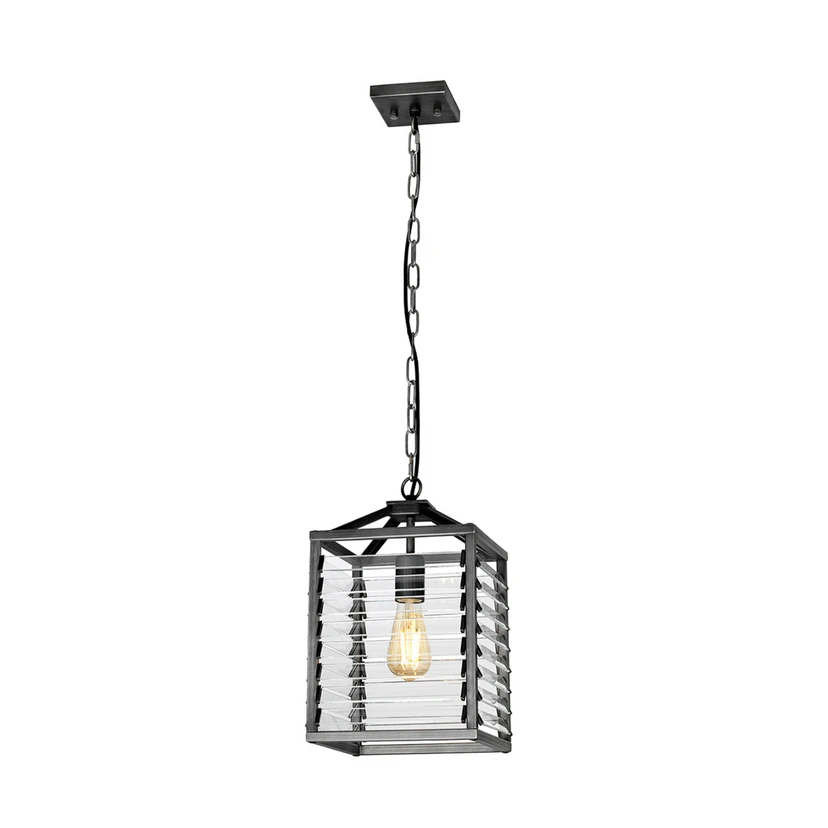 Ein Ambiente im Industriedesign lässt sich mit der einflammigen Hängeleuchte Louvre optimal ergänzen. Ihr Schirm aus Rotguss-Metall in Silber und gebürstetem Schwarz beherbergt eine E27-Fassung, in die am besten eine Filament- oder Rustikalampe eingesetzt wird, da der Blick auf das Innere des Schirms durch die klaren Lamellen aus Glas rundherum frei bleibt.
