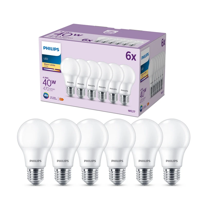 E27 LED-Lampe, 4,9W, 470lm, 2.700K mit mattem Kunststoffkolben, im 6er-Set