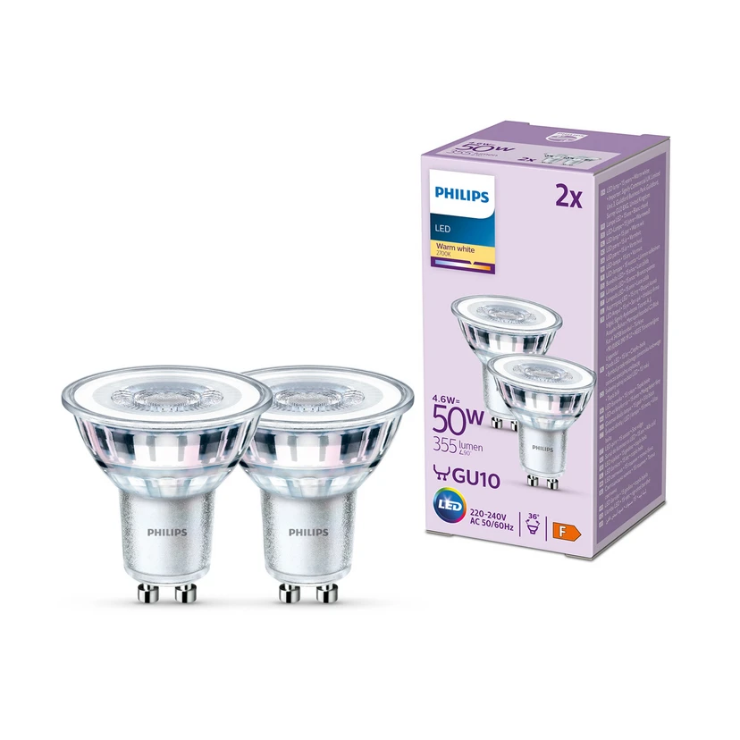 GU10 LED-Reflektorlampe, 4,6W, 355lm, 2.700K mit klarem Glas, im 2er-Set