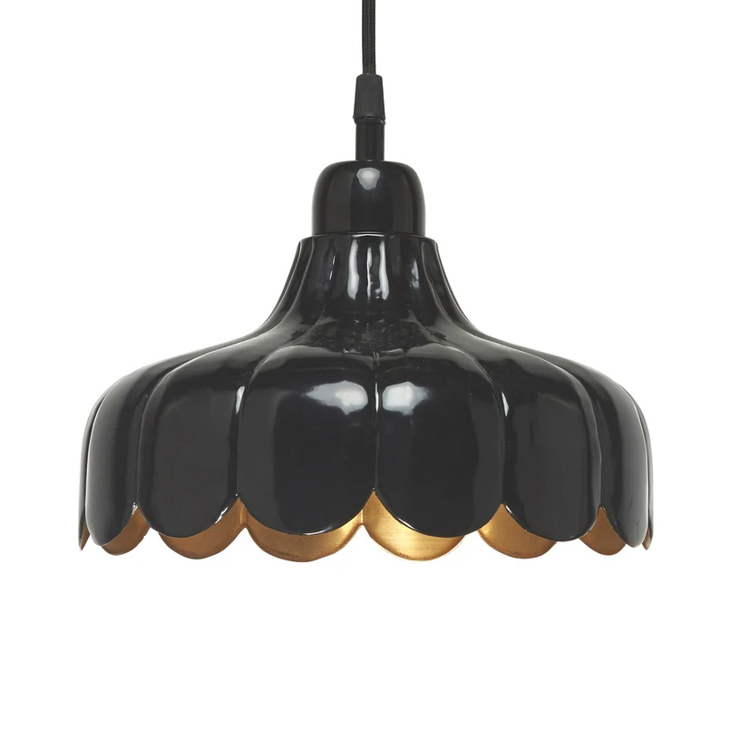 Die Hängeleuchte Wells besteht aus einer Textil-Abhängung sowie einem Metallschirm mit goldfarbener Innenseite. Der Schirm ist von Hand gefertigt und in Blumen-Optik gestaltet. Somit bringt er eine romantische Note in den Wohnbereich und sorgt zusätzlich für einen schönen dekorativen Akzent. Die goldfarbene Innenseite reflektiert das Licht und bewirkt einen besonders warmen Glanz. Die Hängelampe Wells lässt sich beispielsweise ideal zur Beleuchtung des Wohn- oder Esszimmertisches oder der Küchentheke nutzen. Das Leuchtmittel ist nicht inklusive und kann frei gewählt werden. Dank der Ausstattung mit langem Steckerkabel erfolgt die Stromversorgung über die Steckdose.