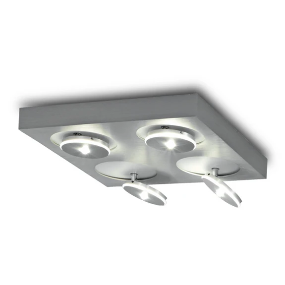 Die vierflammige Deckenleuchte Spot It ist eine wunderbare Designerleuchte. Sie besteht aus einem quadratischen Gestell aus Aluminium, in dem sich vier Kreise abzeichnen. Auf den Kreisen sitzen die eigentlichen Leuchten, die mit einem Gelenk am Gestell befestigt sind und sowohl fast bündig an das Gestell angelegt als auch ein Stück herausgezogen und um 360° gedreht werden können. Die Leuchtmittel können so in verschiedene Positionen gebracht werden und strahlen den Raum individuell aus. Die Schirme des Leuchtmittels haben eine Aluminiumabdeckung, das Licht strahlt durch den Mittelpunkt der Leuchten und durch den Rand. Doch Spot It ist nicht nur eine schicke Leuchte, die an der Decke montiert werden kann, sie sorgt mit ihrer LED-Beleuchtung für wohlig-warmes Licht und ist dabei noch energiesparend. Die Leuchte ist dimmbar.