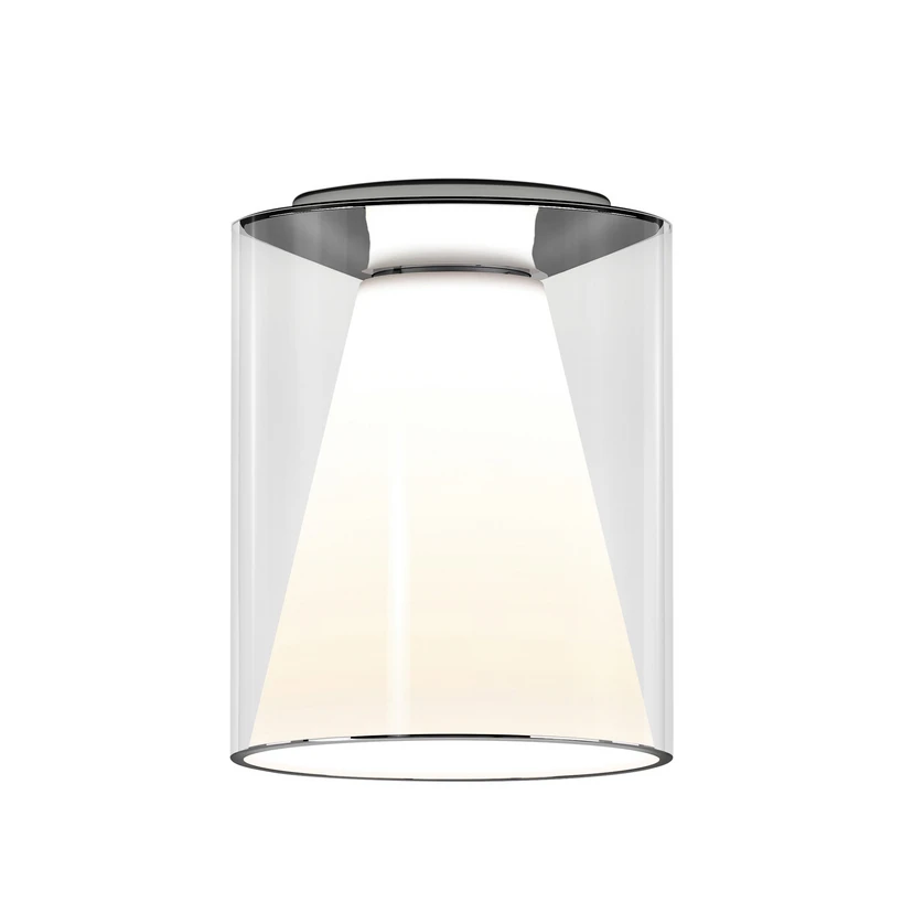 Optisch definiert sich Drum als Spiel geometrischer Formen, das besonders geeignet ist, geradlinige Architektur zu akzentuieren. Der zylindrische Schirm aus mundgeblasenem Glas beherbergt einen aus Polycarbonat bestehenden Kegelstumpf als Innenreflektor, der sich in der glänzenden Oberfläche der aus Aluminium produzierten Leuchteinheit spiegelt. Gleichzeitig bewirkt der Reflektor eine sanfte Lichtstreuung ringsum sowie ein nach unten gerichtetes Direktlicht.