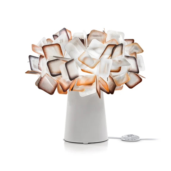 Die einzelnen Plättchen von Clizia sind aus Opalflex® gefertigt, einem innovativen Material, das eine Mischung aus Technopolymer und Glaskristallen darstellt und sich nicht zuletzt durch seine Unzerbrechlichkeit und Vielseitigkeit auszeichnet. Optisch erinnert die Tischleuchte auch an ein liebevoll arragiertes Blumenbouquett und sie überzeugt mit exquisiter Lichtwirkung. Ein patentiertes Magnetsystem erlaubt eine schnelle und bequeme Montage, was unter anderem sehr schön ist, um den Leuchtmittelwechsel vorzunehmen oder die Leuchte zu reinigen.