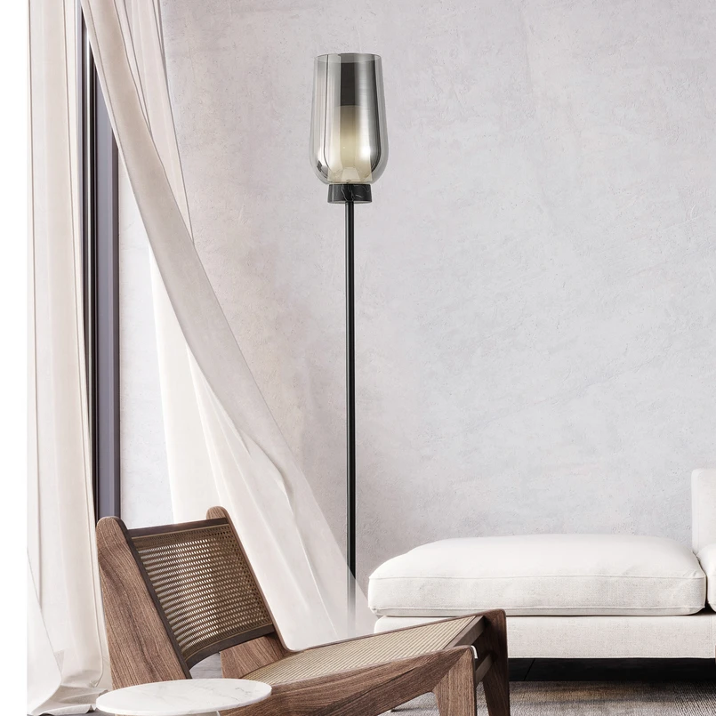 Nora ist eine schlanke Stehleuchte sehr schlicht gestaltetem Gestell aus schwarz lackiertem Metall, auf dem der ästhetische Glasschirm sitzt. Dieser besteht aus zwei Lagen, einem tulpenförmigen Außenschirm, der den Blick auf den konisch geformten, kleinen Innenschirm zulässt. Dieser opalweiße Schirm umgibt das Leuchtmittel und sorgt in Kombination mit dem äußeren Schirm für eine effektvolle Lichtwirkung. Die Stehleuchte ist ideal, um im Wohnzimmer als zusätzliche Lichtquelle zu fungieren und kann mit weiteren Leuchten der Serie ergänzt werden. Die E27-Fassung im Schirm eignet sich zur Bestückung mit einer LED-Lampe bis 20 W, das Leuchtmittel ist nicht enthalten.