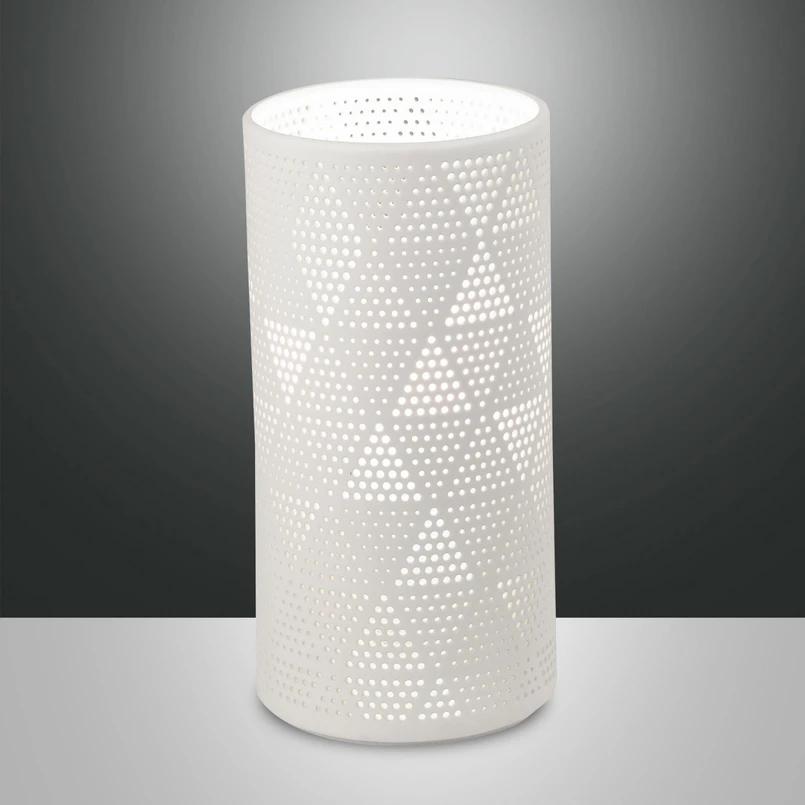 Der zylindrische, oben offene Korpus der Tischleuchte Micol besteht aus weißer Keramik. Er ist durchgängig von kleinen, runden Löchern durchzogen, die in dreieckigen Abschnitten zusammengefasst sind. Im Zusammenspiel mit der einzusetzenden E27-Lampe entstehen effektvolle Lichtmuster an den Wänden und dem umgebenden Interieur. Auf der Fensterbank oder dem Sideboard findet Micol als dekorative Zusatz-Lichtquelle ihren geeigneten Platz.
