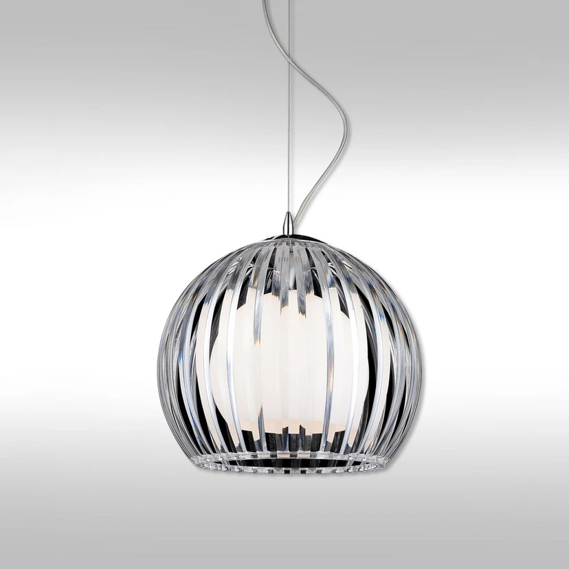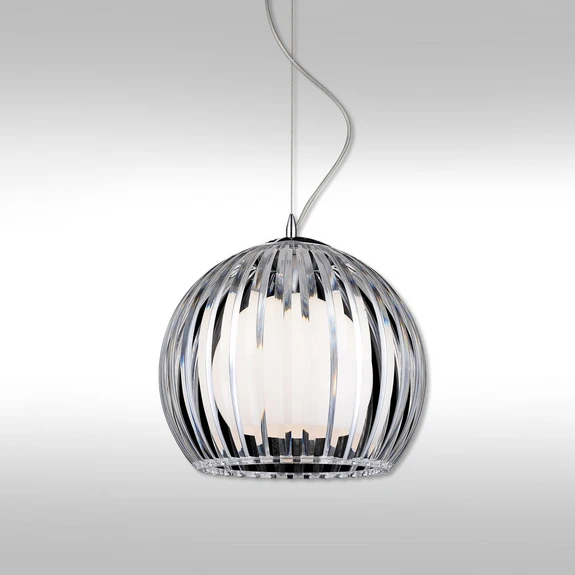 Modern und klar in der Form- und Farbgebung, jedoch sehr auffällig aufgrund der beiden übereinander drapierten Schirme zeigt sich die Hängeleuchte Mandina. Der äußere, gerillte Schirm besteht aus transparentem Plexiglas und gibt den Blick auf den inneren Schirm aus Opalglas frei, der im beleuchteten Zustand eine behagliche Lichtstimmung im Raum schafft.